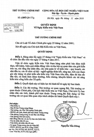 Thủ tướng chính phủ đã ra quyết định số 2008/QĐ-TTg: Chọn ngày 27-4 hàng năm làm Ngày Kiến Trúc Việt Nam.